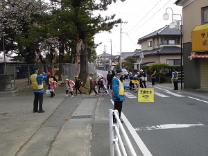先生方が各地区で立哨し、母の会でも、草野地区交通安全協会の皆様もご協力い