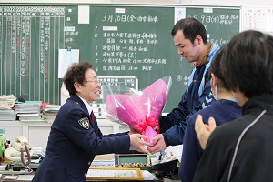 坂本様は23年間にわたって、学校前の交通量が非常に多い旧国道をいつも安全に子どもたちを渡してくれます。日頃の功績が認められて、教職員一同で祝いました。今後も交通安全を呼びかけて、子どもたちを事故から守りたいと話されていました。