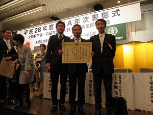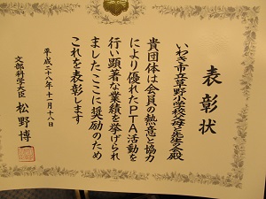 平成28年度優良PTA文部科学大臣表彰の授賞式に東京へ、会長と副会長と校長の3名で行ってきました。文部科学大臣や衆参両文教科学委員会委員長などが出席され厳粛に執り行なわれました。この受賞を契機にさらにPTA活動を充実させていきたいと考えております。