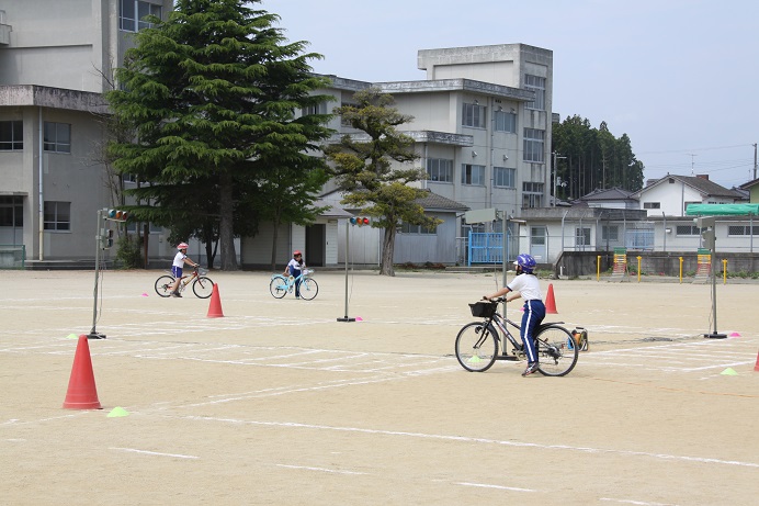3~6年生は、校庭で正しい自転車乗りの仕方を学習しました。