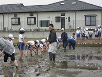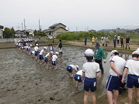 20日に田植えを行いました。本校の5年生が毎年行い、今年で26回目です。講師に富岡正治第21代PTA会長様をお迎えして、5年生84名のほとんどの児童が初めての体験をしました。裸足になってあのぬるぬる感や足が土からぬけないなど、子どもたちにとって貴重な時間を過ごすことができました。10月に収穫をして、11月の秋祭りでの餅つきが楽しみです。