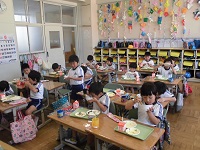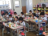 本校・分校合わせて74名の1年生は入学して3ヶ月が経とうとしています。みんな元気に登校して、活気あふれる声が校長室まで届きます。大好きな給食の時間は、おいしくいただいております。