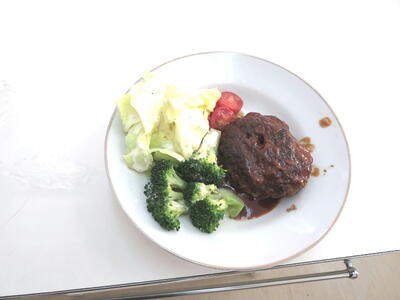 調理実習でハンバーグを作りました。材料の中身と分量を見直して、学習をまとめています。「鶏肉、何グラムだったかな?」