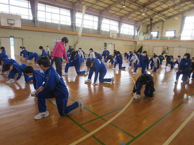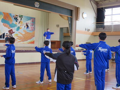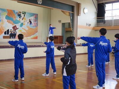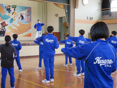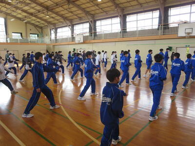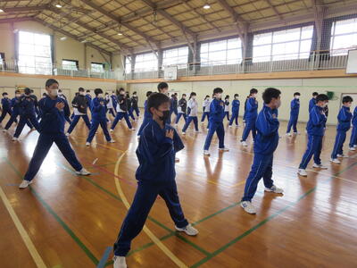 2022年12月13日 12時42分12月13日(火)、1年生の武道「空手」の授業は3時間目。いよいよ基本の型の練習に入りました。