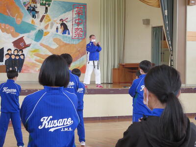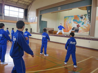 【 空手の佐藤先生が手本を示し、生徒はまねながら学んでいきます 】