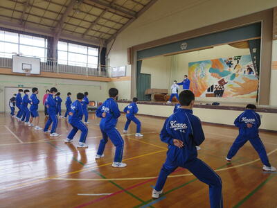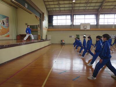 12月13日(火)、1年生の武道「空手」の授業は3時間目。いよいよ基本の型の練習に入りました。