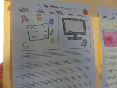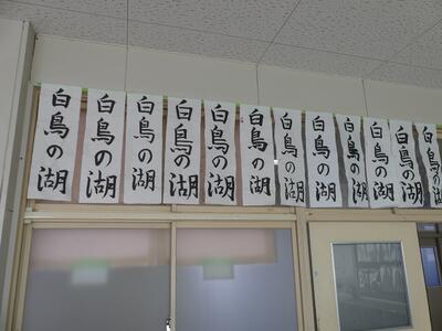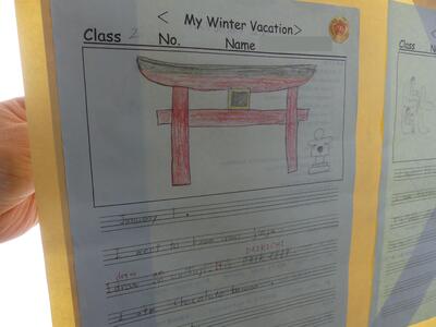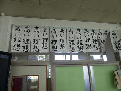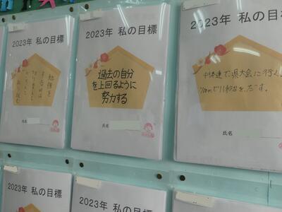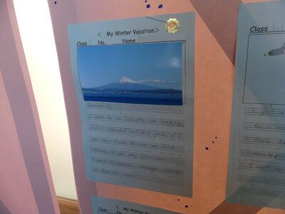 冬の掲示物です 2023年1月18日 16時41分 1月18日(水)、冬休み明け、新年の掲示がされています。 【新年と言えば、まずは書き初めですね】【冬休みを振り返って 英語で絵日記です】【そして新年の抱負!】願いが叶うように、努力しましょう