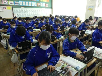 【授業の様子】 学習課題について予想し、タブレットに記入しています(理科)