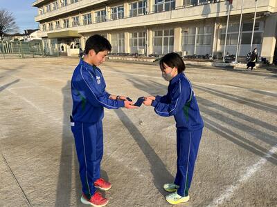 今朝の練習が最後でしたので、練習の最後に全員で頑張ってきたことをたたえ合い、明日出場する選手を激励しました。また、男女のキャプテンからお互いにタスキを渡し、志気を高め、全員で心を一つにしていました。