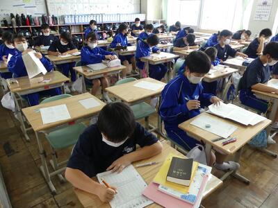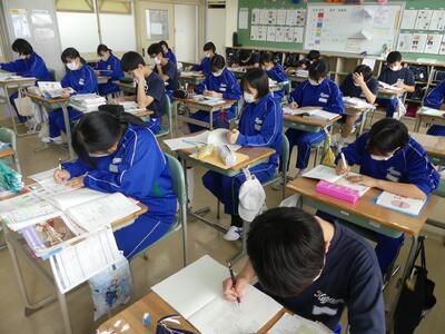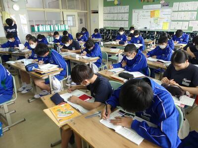 5月22日(月)、昼休みの様子です。給食の片づけなどが終わると、どの生徒も自席について自主学習です。