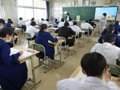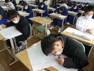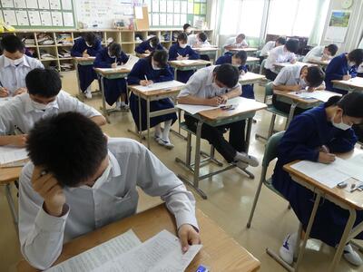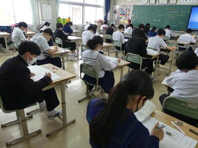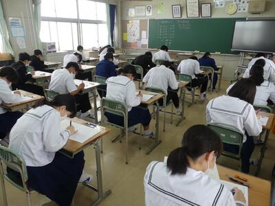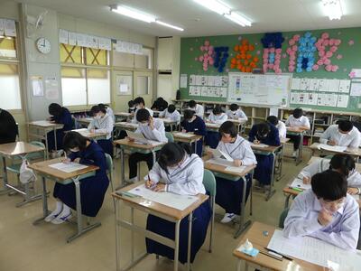 1年生にとっては、初めての定期テスト。写真は1時間目の様子です。とても集中してがんばっている様子がみてとれます。国語、数学、英語、理科、社会の5教科。給食をはさんで5校時まであります。ファイト!