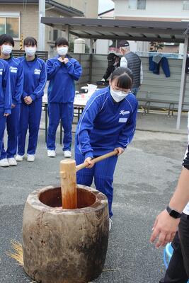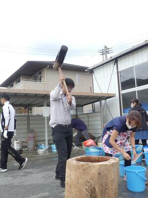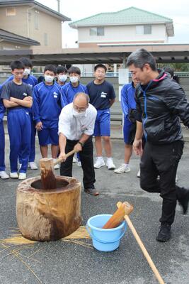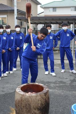 【教員も餅をつきました。最後は3学年主任が願いを込めて・・・】