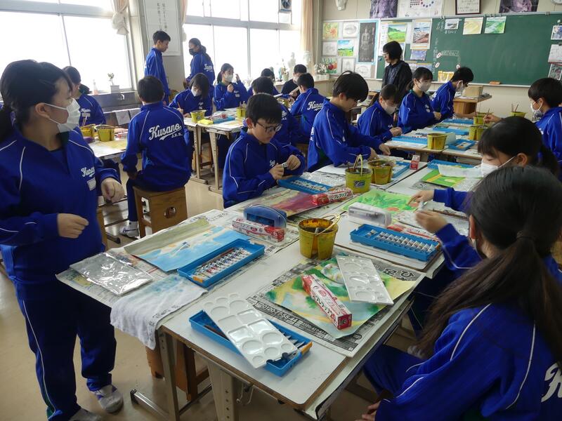 【1、2年生は普通授業です】写真は1年生の美術の様子です。水彩画を描いています。創造力に想像力。心を豊かにしたいですね。