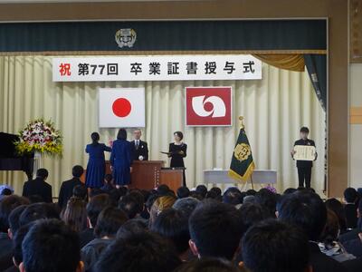 3月13日(水)、ご来賓、保護者の皆様のご臨席をいただき、第77回卒業証書授与式を無事行うことができました。皆様ありがとうございました。厳かな中にも卒業の喜びを噛みしめる感動的な式になりました。