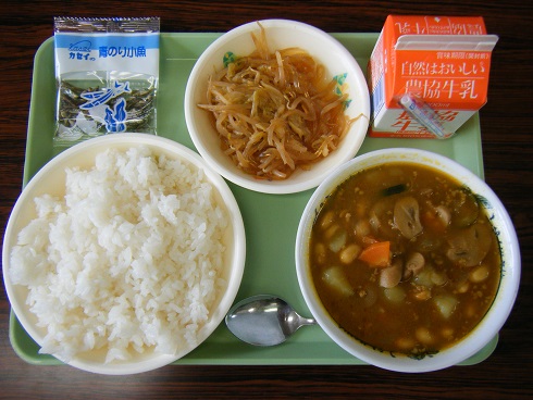 本日の給食の献立は、ごはん、牛乳、中華煮びたし、大豆のカレースープ、小魚。730キロカロリーです。
