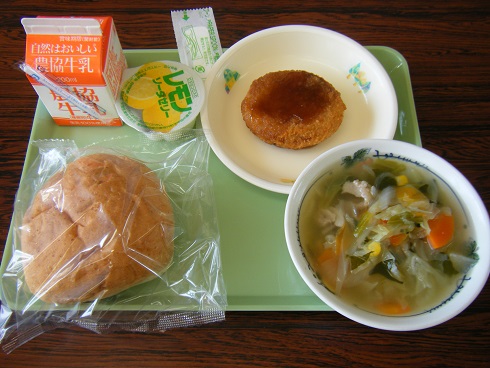 本日(10月26日)の給食です。 2017年10月26日 15時45分 本日の給食の献立は、バーガーパン、牛乳、キャベツメンチカツ・ワインソース、野菜スープ、レモンソーダゼリー。891キロカロリーです。