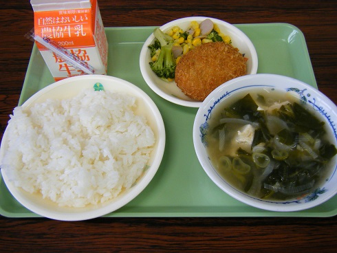 本日(11月14日)の給食です。 2017年11月14日 12時05分 本日の給食の献立は、ごはん、牛乳、野菜メンチカツ、ブロッコリーとソーセージのソテー、豆腐とほうれん草のとろみスープ。783キロカロリーです。
