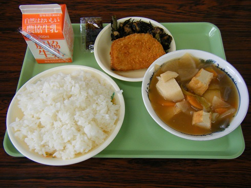 本日の給食の献立は、ごはん、牛乳、かじきカツ、ソース、ひじきの油炒め、八杯汁。830キロカロリーです。