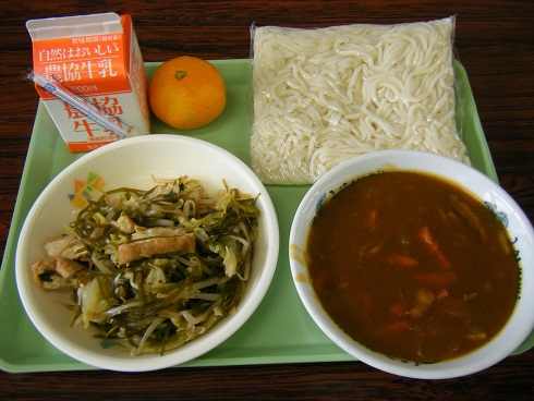 本日の給食の献立は、米粉のカレーなんばん<ソフトめん+カレー南蛮>、牛乳、生揚げ入り煮びたし、みかん。877キロカロリーです。