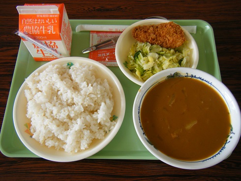 本日の給食の献立は、チキンカレーライス<麦ごはん>、牛乳・コーヒー、とんかつ、ゆで野菜。891キロカロリーです。
