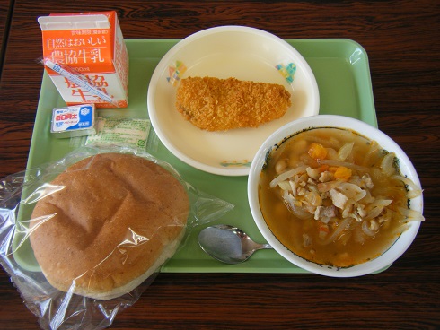 本日(12月14日)の給食です。 2017年12月14日 12時26分 本日の給食の献立は、バーガーパン、牛乳、サーモンフライ、タルタルソース、サンシャイントマトのミネストローネ、チーズ。830キロカロリーです。