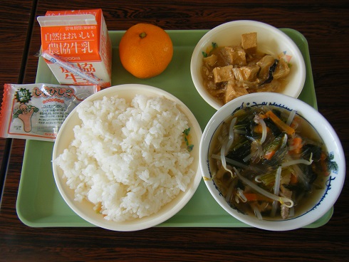 本日の給食の献立は、ごはん、しそひじき、牛乳、マーボー厚揚げ、春雨ともやしのスープ、みかん。747キロカロリーです。