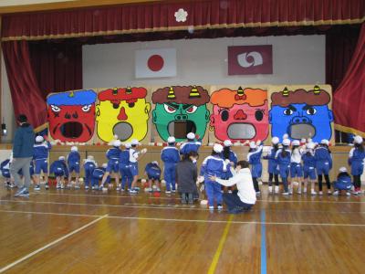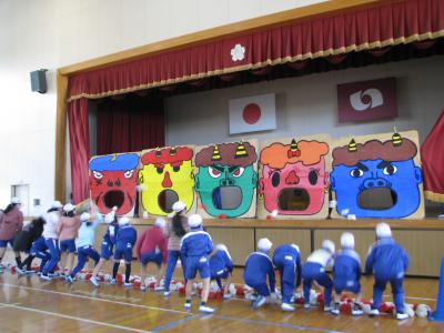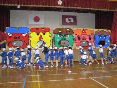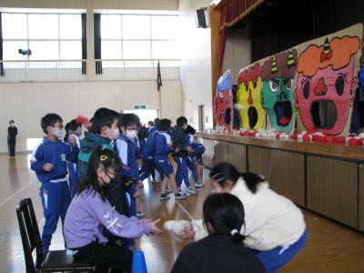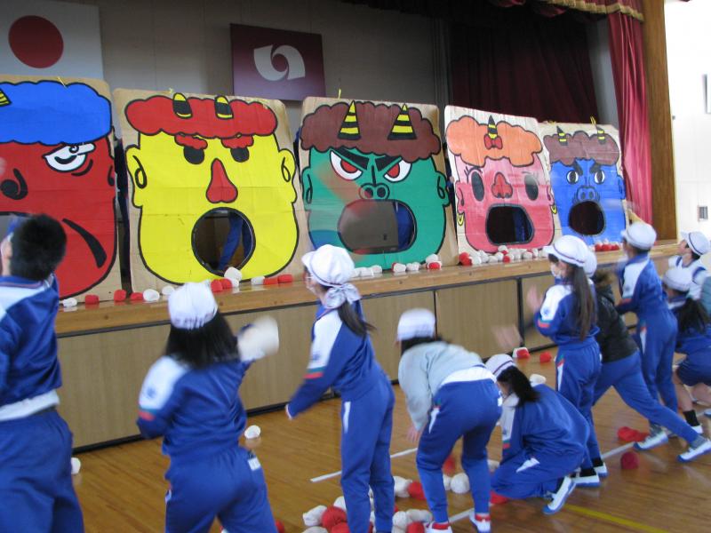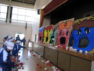 2月2日の節分の豆まき集会は、3密を避けるため放送で行いましたが、御厩小恒例の鬼払いゲームは低学年中学年高学年と3日に分けて、体育館で行われました。みんな鬼の口めがけてお手玉を投げ、たくさん入れたクラスが勝ちです。ちなみに優勝は、2年2組190個です。