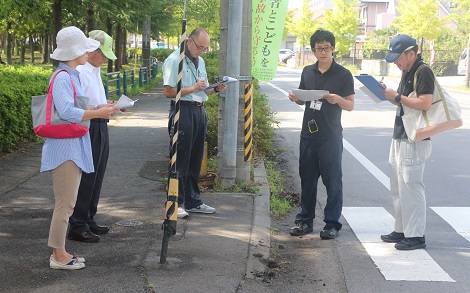 参加者は、見守り隊の小松さん、交通安全母の会の佐藤会長、校長、市教委の担当、道路管理課の職員2名の6名です。