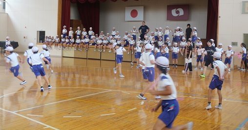 おやおや? 3・4年生が体育館のステージに腰をおろしています。