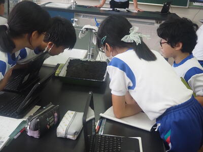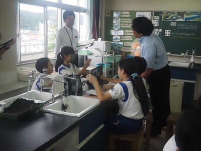 写真奥に見えるのは、流れる水のはたらきを調べる実験装置です。教科担任の先生が準備してくれました。手作りです。下はその実験装置をもう一度観察している様子です。