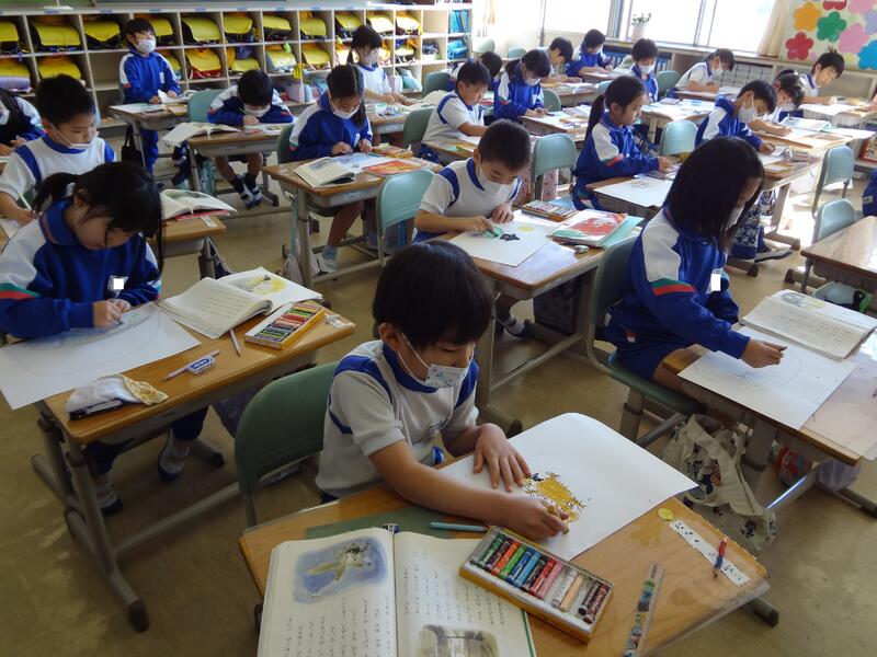 生活科で、自分の成長を絵巻物にまとめる準備をしていました。