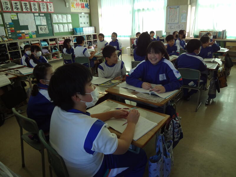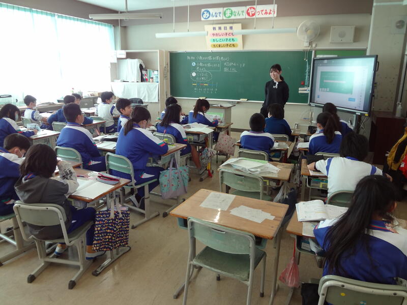 先生が素敵な笑顔で問いかけています。算数の「小数」の学習です。この笑顔で、子供たちの思考は活性化され、難しい問題もなんとか解ける気持ちになることでしょう。とても大事なことです。