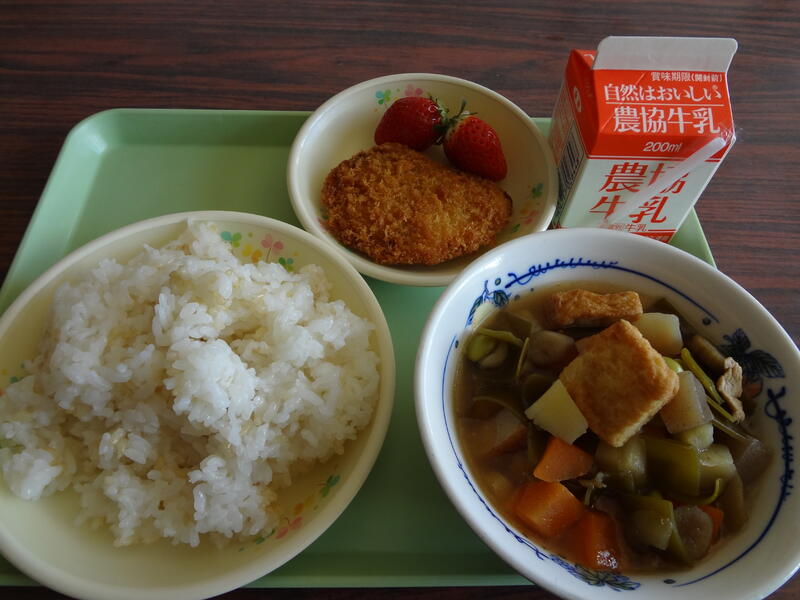 今日は、玄米入りごはん、牛乳、ぶりのみそづけフライ、五目豆にいちごが2つ付いて682Kcalでした。ごちそうさまでした。