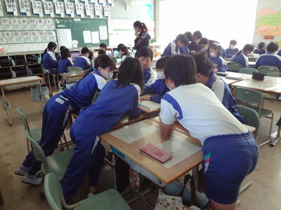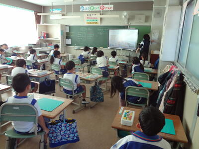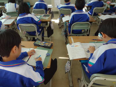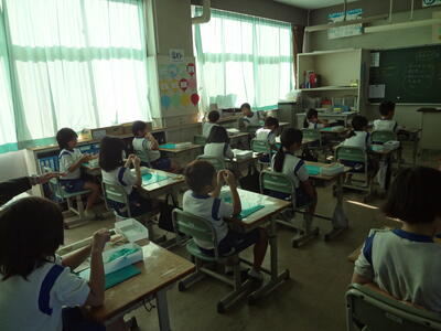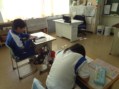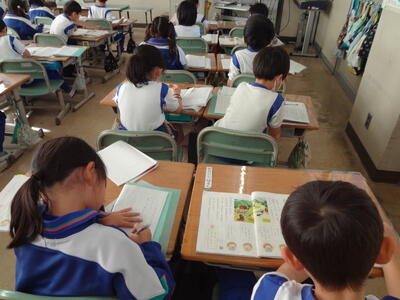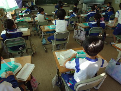 1年生は、国語の授業です。作文を書く授業です。2年生は、図工です。「おもいでをかたちに」、学校生活の思い出を粘土を使って、形にします。