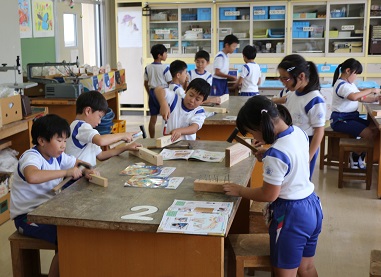 音のする方に行くと、3年2組の子ども達が くぎ打ちをしていました。