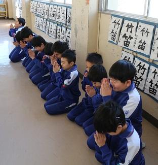 おやおや、4年1組の廊下には、男子がお祈りをしています。