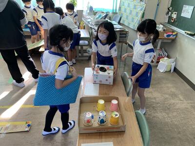 2校時は、2年生の教室でおもちゃまつりが開かれました。2年生が手作りのおもちゃを準備して、1年生を迎えました。