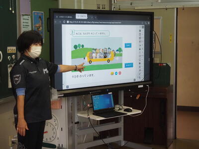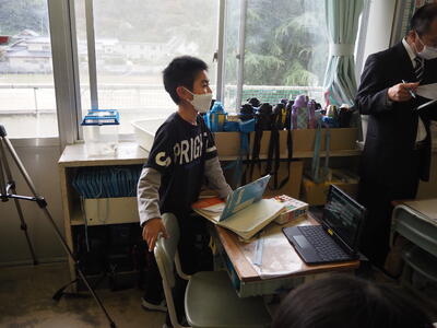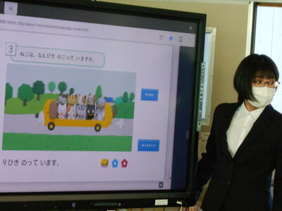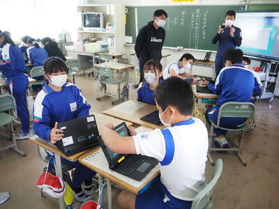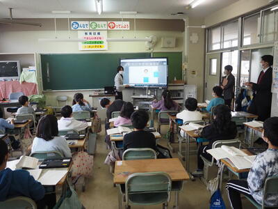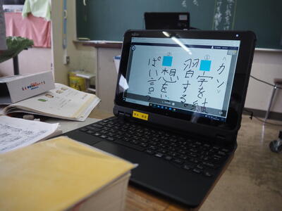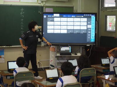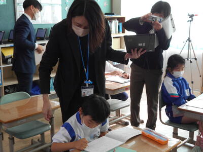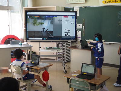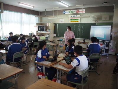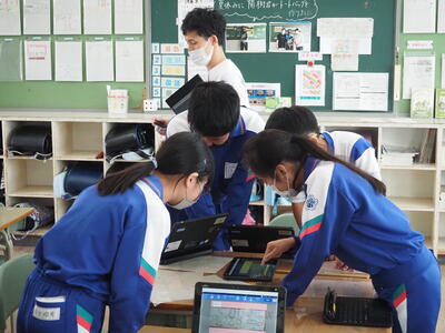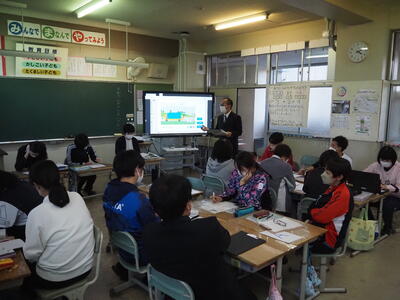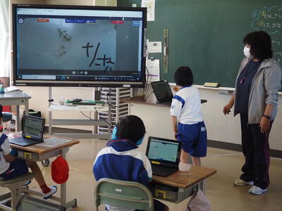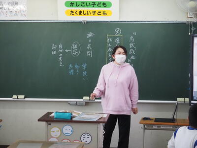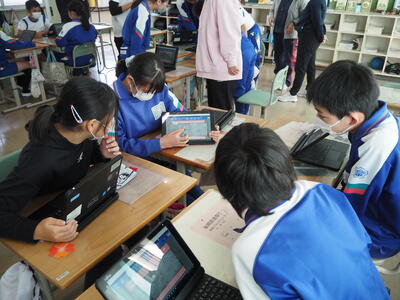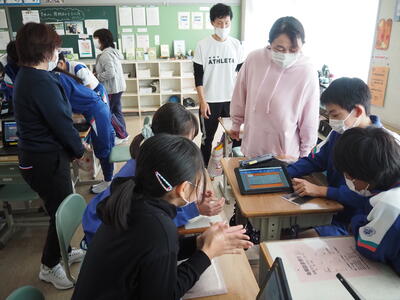 国語の授業研究を行い、いろいろな先生が見に来ました。「鳥獣戯画」の学習です。自分が気付いた作品の素晴らしさを、タブレット端末を使って友達に伝えました。