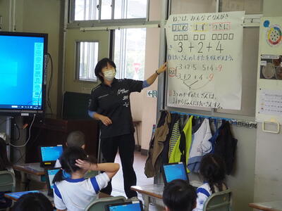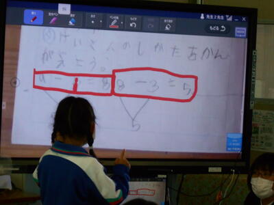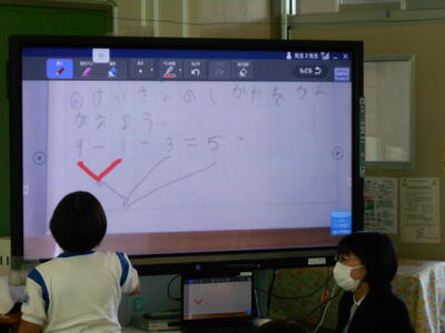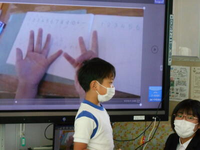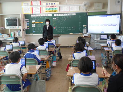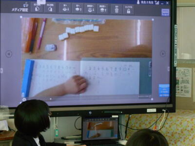 今日は1年2組の教室で研究授業を行いました。本校では今年度、ICTを活用して「主体的・対話的で深い学びの視点からの授業改善」を目指して校内研修を行っています。今回は算数でのICT活用でした。