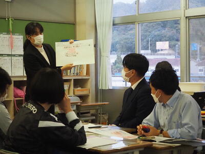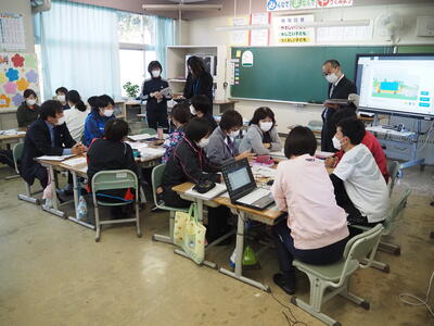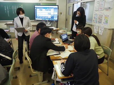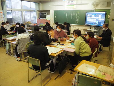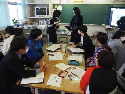 研究授業を行った1年2組の教室で事後研究会を行いました。子どもたちも積極的でしたが、先生がたも積極的に意見交換を行い、研究協議も充実しました。