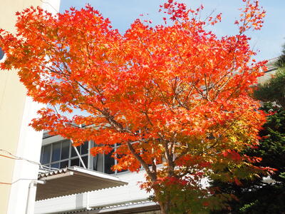 御厩小の校庭ではご覧のように木々が鮮やかに色づいています。