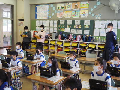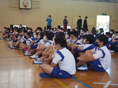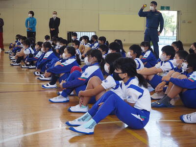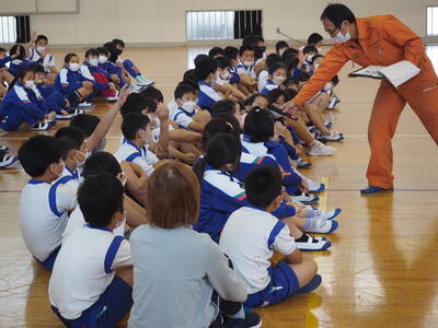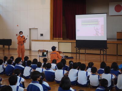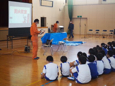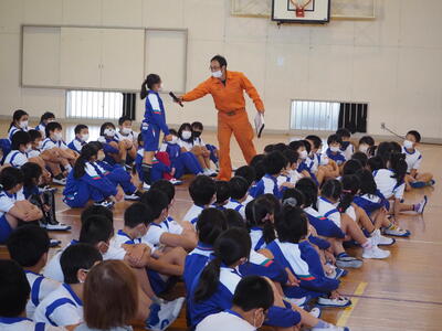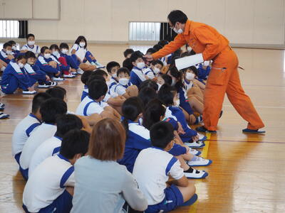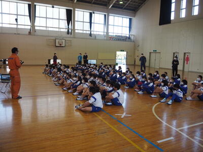 今日の2校時は、内郷消防署から4名の講師の方をお迎えして、3・4年生が防火教室を行いました。火が付くときに必要な3つの要素や、火が消えるときの3つの要素などを署員の方から聞かれましたが、子どもたちは進んで発表していました。また、フライパンの油に火が移る実験も行い、子どもたちは火の扱うときの注意について改めて学びました。