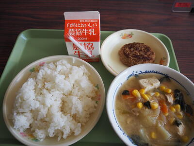 今日の献立は、ごはん、牛乳、ハンバーグ・やさいおろしソースかけ、どさんこ汁が出て597kcalでした。ごちそうさまでした。