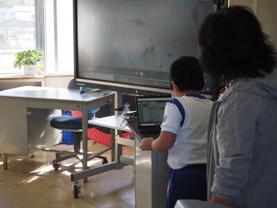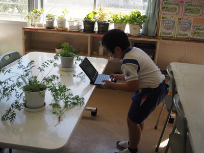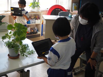 生活科で植物の観察カードをかいています。1・2年生の子どもたちがタブレットコンピューターを使って、自分で写真をとって、気付いたことを書きました。