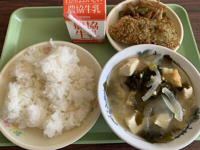 今日は、ごはん、牛乳、白ざかなのりごまあげ、こんにゃくのきんぴら、わかめのみそ汁でした。白ざかながとっても美味しかったです。
