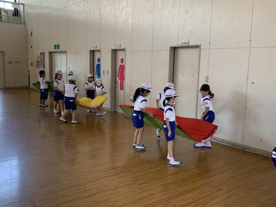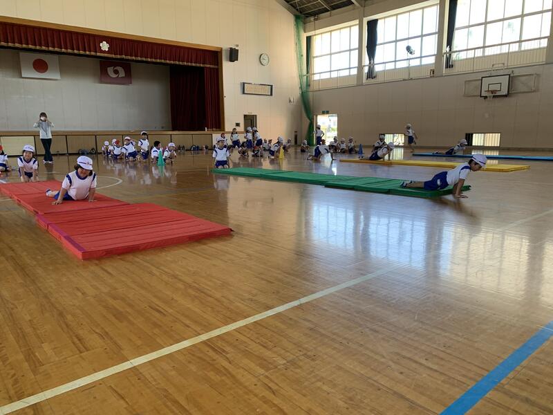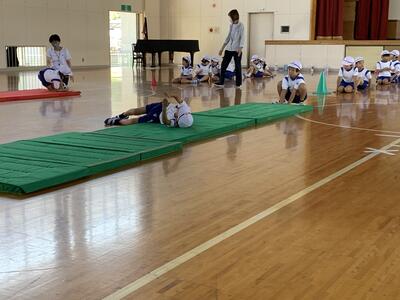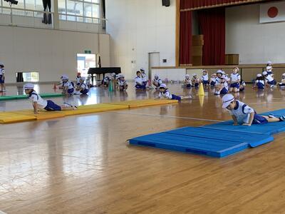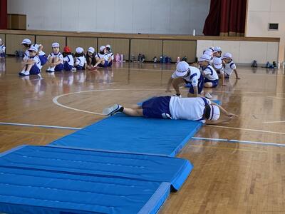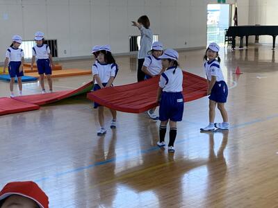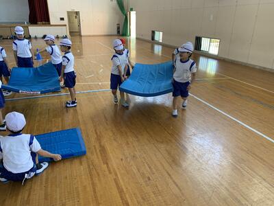 体育の授業でマットを使った運転遊びをしていました。手を使って進んだり、転がったり。マットの安全な運び方も習いました。
