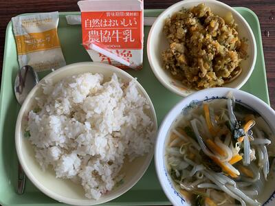 ドライカレー、麦ごはん、野菜スープ、牛乳、バナナミルメークをいただきました。カレーで食が進みます。ごちそうさまでした。