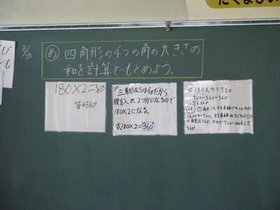 算数の授業で「四角形の4つの角の大きさの和を計算でもとめよう」というめあてで学習していました。