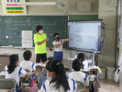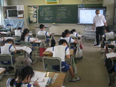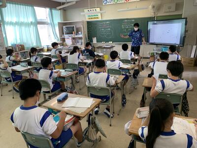 算数で最小公倍数の学習をしていました。先週学習したことを振り返ってから、今日のめあてに入っていました。先生が丁寧に振り返っていたので、今日の課題についてすぐに反応する子がたくさんいました。