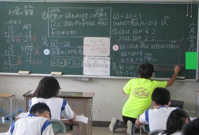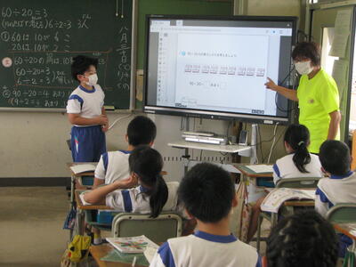 こちらも算数でした。「色紙が60まいあります。この色紙を一人に20まいずつ分けると、何人に分けられますか」という問題に取り組んでいます。訪問したときに、ちょうど自分の考えを発表している子がいました。